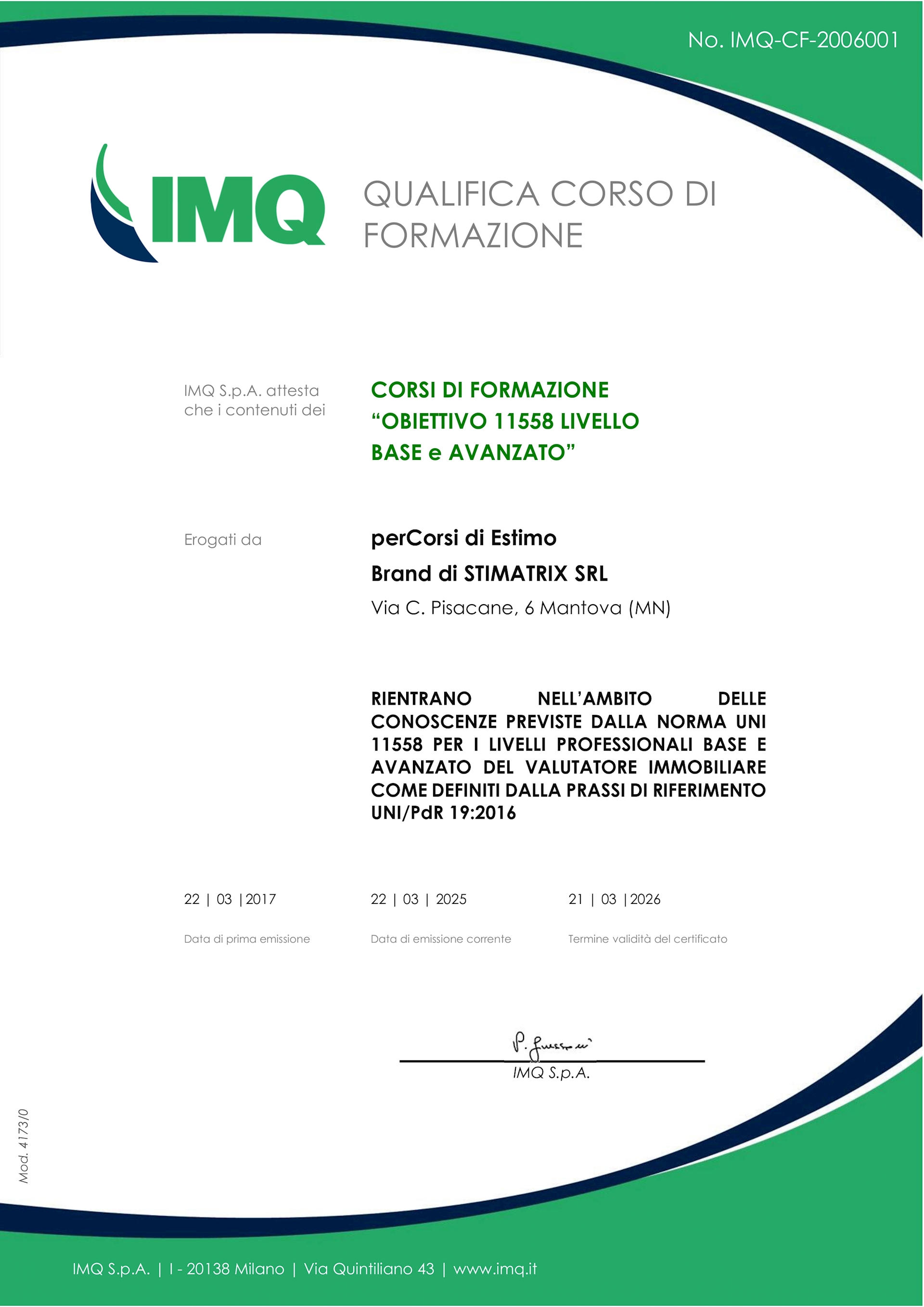 I principali Organismi di Certificazione Italiani hanno Qualificato il Corso di Formazione Obiettivo 11558 LIVELLO BASE e AVANZATO e attestano che i contenuti rientrano nell'ambito delle conoscenze previste dalla norma UNI 11558 per i livelli professionali base e avanzato del valutatore immobiliare come definiti dalla prassi di riferimento UNI/PdR 19:2016.